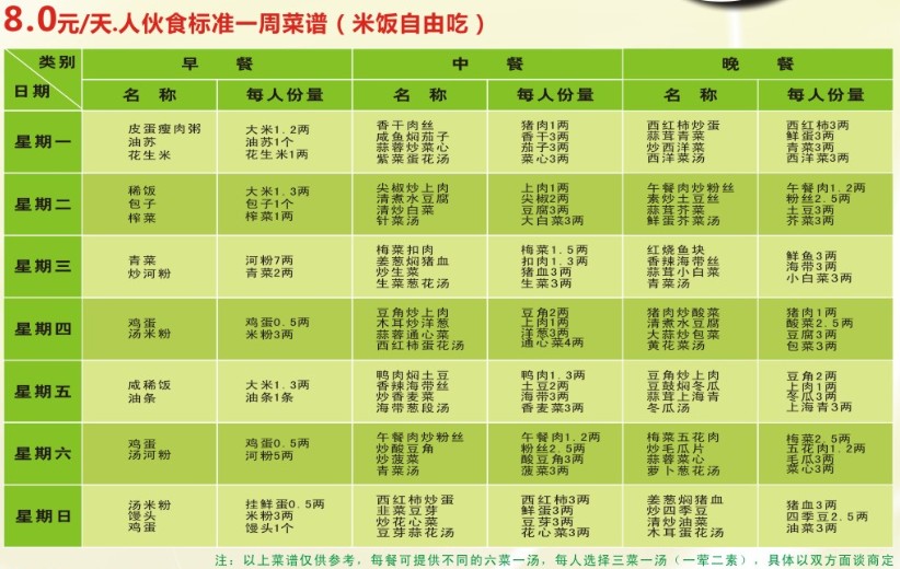 注:8.0元/天.人伙食标准,每餐可提供不同的六菜一汤,每人选择三菜一汤(一荤二素),具体以双方面谈商定。