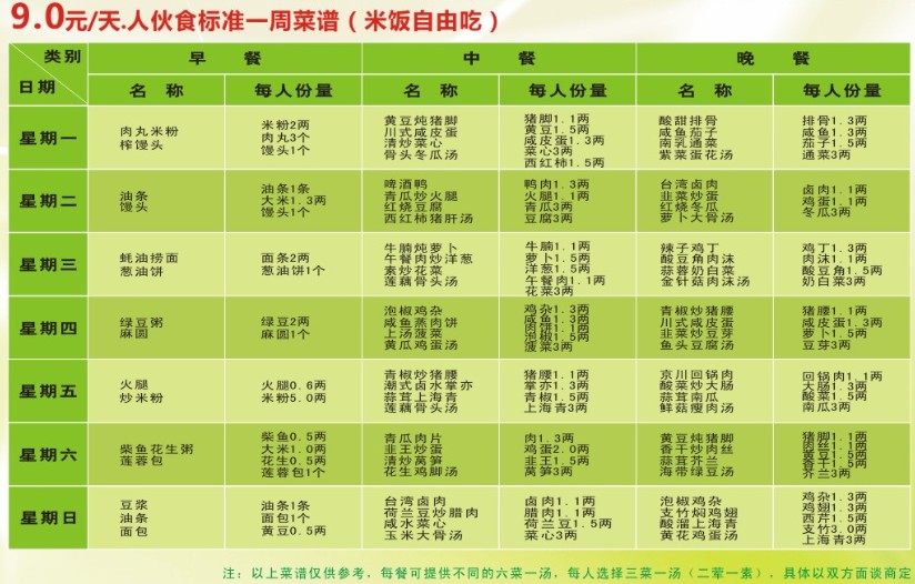 9.0元/天.人伙食标准,每餐可提供不同的六菜一汤,每人选择三菜一汤(二荤一素),具体以双方面谈商定。