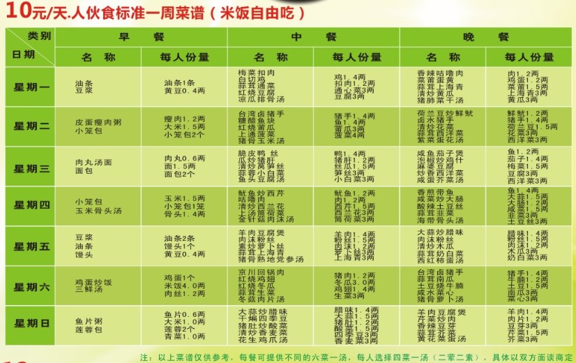 10元/天.人伙食标准,每餐可提供不同的六菜一汤,每人选择四菜一汤(二荤二素),具体以双方面谈商定。